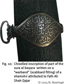 s a wide range of techniques, from flat gold-inlaying "tahneshan", raised gold-inlaying "zarneshan", gold-overlaying "zarkhanest" to chiseling and embossing. Other decorative methods, such as "malilekari" (filigree), and "minakari" (enamelling) for decorating scabbard fittings and handles can also be observed on some pieces. Each one of these decorative techniques is discussed in detail in the book. One important part of this book is an analysis of the meaning and the symbolism of Dhulfaghar, the bifurcated sword attributed to Imam Ali. Based on the lexicon of Dehkhoda, an analysis of artwork, the