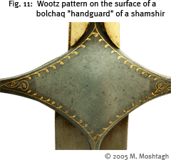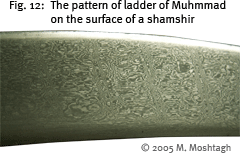 discussed in the book. A number of these weapons are shown in the book, along with an extensive discussion of the different punched stamps of their makers. Although the blades of a number of these weapons were made of plain, carbon steel, beautiful examples of qaddare and qame with wootz blades are also included. One of the most interesting qame is attributed to Abbas Mirza Qajar; this weapon has a pattern welded blade. This specimen is especially interesting because of the rarity of any Iranian-made weapon with the entire blade made out of pattern-welded steel. This unique specimen stands in contrast to other examples, also included in the book, of qaddares with pattern-welded cores, visible only in the fullers, and welded-on carbon-steel edges.