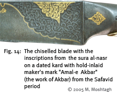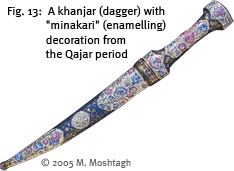 also analyzed in the book. Beautiful examples of khanjar with carved ivory and walrus ivory are pictured. The choice of topics for carving varies from scenes from Shahname, farangizasi (Europeanizing) to even explicit erotic scenes. A number of highly interesting examples of kard are also shown in the book and a classification system of different types of kard is discussed in detail. Many of them show magnificent chiselling "qalamzani" and gold-inlaying in floral design on their blade fortes. One of the rare weapons in the Iranian weapons arsenal is a type of pishqabz which has a double-curved and single-edged blade. Different examples of this weapon are shown in the book and meticulously discussed.