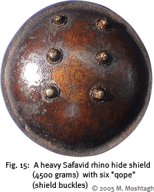 already in use during the Bronze Age. Later on, this prestigeous weapon was also mentioned in the epic Shahname, and drawn in many miniatures. During the Qajar period, many bull-headed maces were made as well. The interesting point is that bull-headed maces were used not only as weapons but also as ritual objects in Zoroastrian ceremonies. A discussion of the Tabar (axe) makes up another chapter of the book. Different types of bronze axes from Luristan are shown. Additionally, other archeological examples of axes from different eras in Iran are also presented and discussed. Another chapter deals with the construction of shields; different types of hide shields and steel shields are presented and classified.
