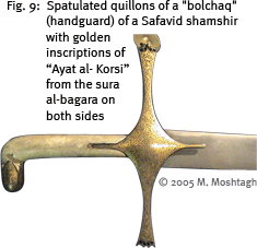 unfullered blades during the Safavid period, they also used a number of other shamshir with fullered blades or blades with raised back edges. A number of swords were signed with gold-inlaid cartouches carrying the names of swordmakers, such as "Amal-e Askari Isfahani" (The work of Askari Isfahani). The research in this book shows that other names, such as Assadollah and Kalbali, which appear on the gold-inlaid cartouches over the centuries should be seen as honorary titles used to signal a high level of mastery in forging reached by the swordsmith. The highest level was, of course, sealed with "Amal-e Assadollah Isfahani" (The work of Assadollah Isfahani). Different decoration methods used on handguards (or "bolchaq"), scabbard fittings ("warband"), handle straps ("ahanak"), and pommel cap ("kolah") are discussed in detail in the book. These decoration methods encompas
